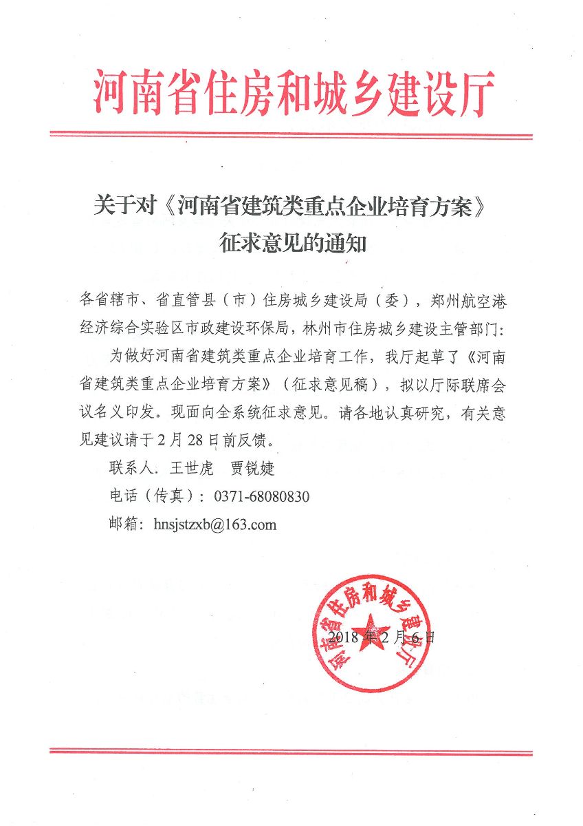 省住建廳關(guān)于對(duì)《河南省建筑類(lèi)重點(diǎn)企業(yè)培育方案》征求意見(jiàn)的通知