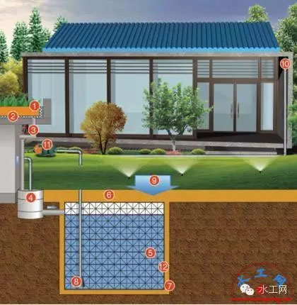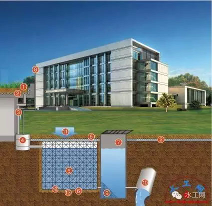 1.屋頂花園 2.排水網(wǎng)絡(luò) 3.重力雨水管 4.過濾井 5.雨水模塊 6.干凈的粗河砂 7.防水層 8.吸水管路 9.地表滲水 10.虹吸雨水管 11.地面水泵 12.土工織物商業(yè)、工程應(yīng)用