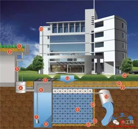 1.屋頂花園 2.排水網(wǎng)絡(luò) 3.重力雨水管 4.過濾井 5.井蓋 6.排放控制井 7.回用管路 8.過濾網(wǎng) 9.雨水模塊 10.干凈的粗河砂 11.防水層 12.市政管道 13.地表滲水 14.地面水泵 15 虹吸雨水管 16.土工織物