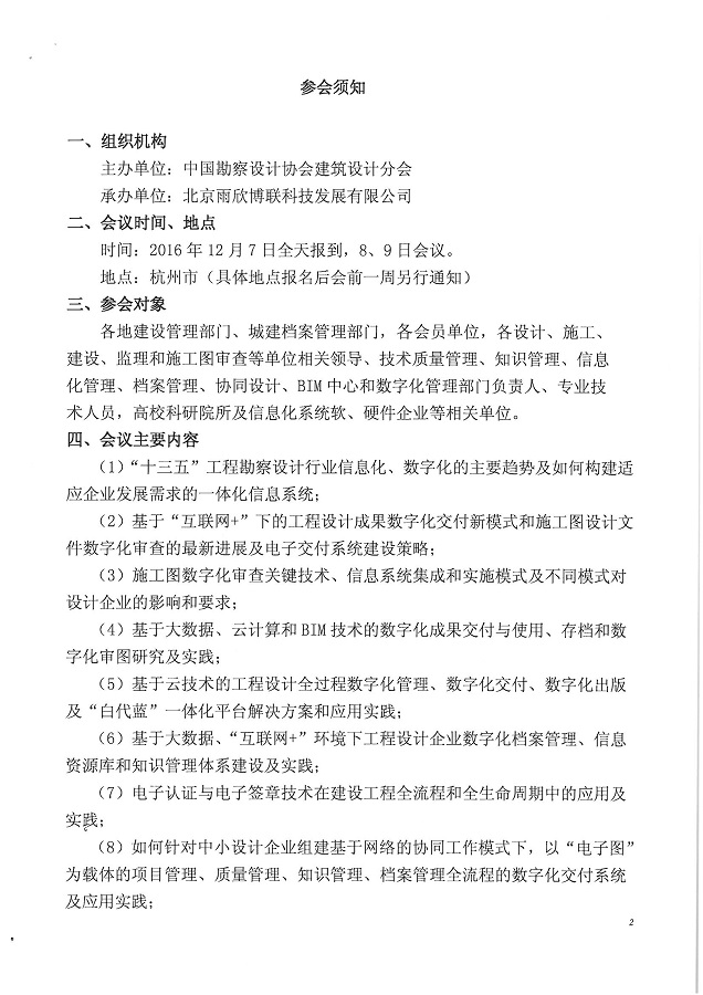 中國勘察設(shè)計協(xié)會建筑設(shè)計分會于2016年12月7-9日在杭州舉辦“工程設(shè)計企業(yè)數(shù)字化管理、數(shù)字化成果交付與數(shù)字化審圖落地實踐經(jīng)驗交流會”. 現(xiàn)將《關(guān)于舉辦“工程設(shè)計企業(yè)數(shù)字化管理“數(shù)字化成果交付與數(shù)字化審圖落地實踐經(jīng)驗交流會”的通知》(中設(shè)建字〔2016〕第036號文件)予以轉(zhuǎn)發(fā)。